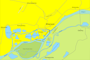 Cherson liegt am Beginn des Mündungsdeltas des Dnepr[wp]. Bis zum Schwarzen Meer[wp] sind es noch rund 30 Kilometer. 60 Kilometer nordwestlich der Stadt liegt die Hafenstadt Mykolajiw[wp], knapp 100 Kilometer südöstlich beginnt die Krim.